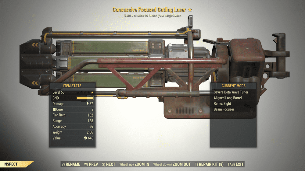 Concussive weapons are among those that have been spawned in via a patched loophole within the game. They are glitched, causing a target’s graphics to freeze in place upon impact, rendering their subsequent movements invisible to the shooter. The concussive effect may be fixed by Bethesda in the future.