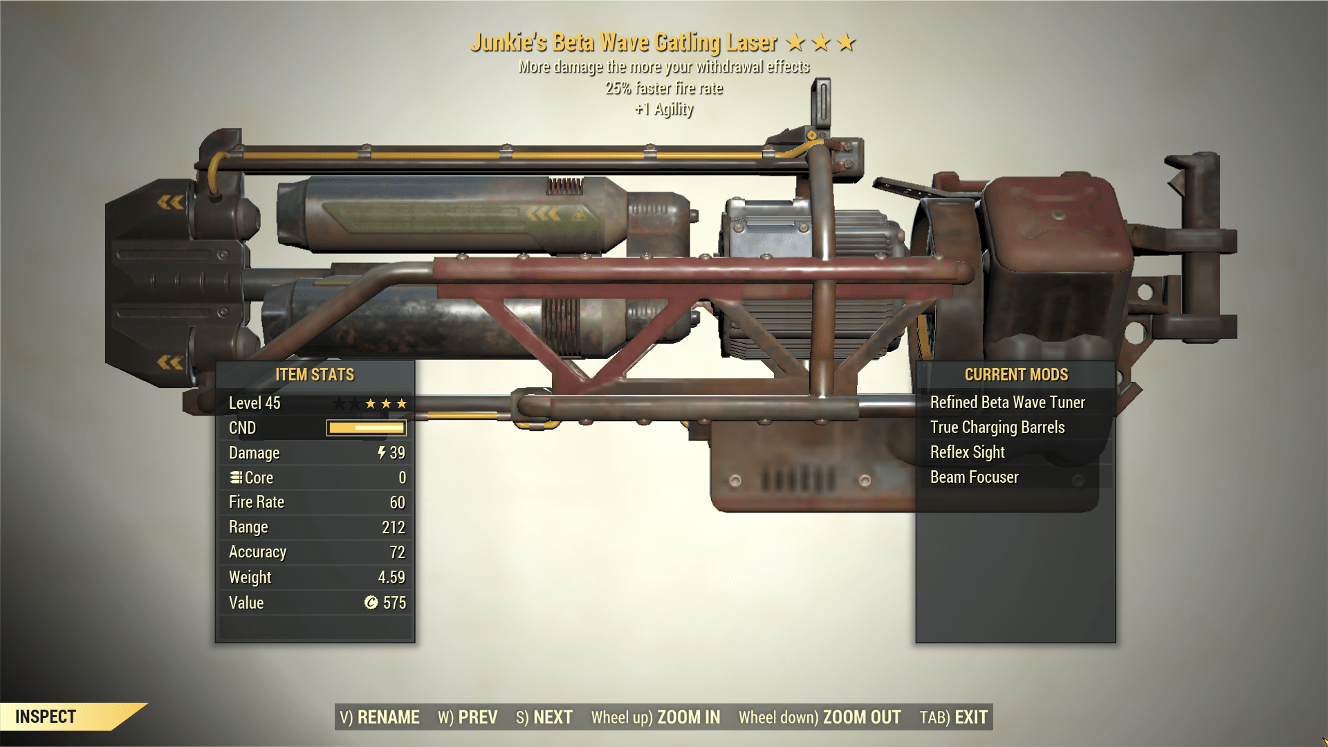 3* Junkie’s GATLING LASER 25% Faster Fire Rate [+1 Agility] Fallout 76 (PC)