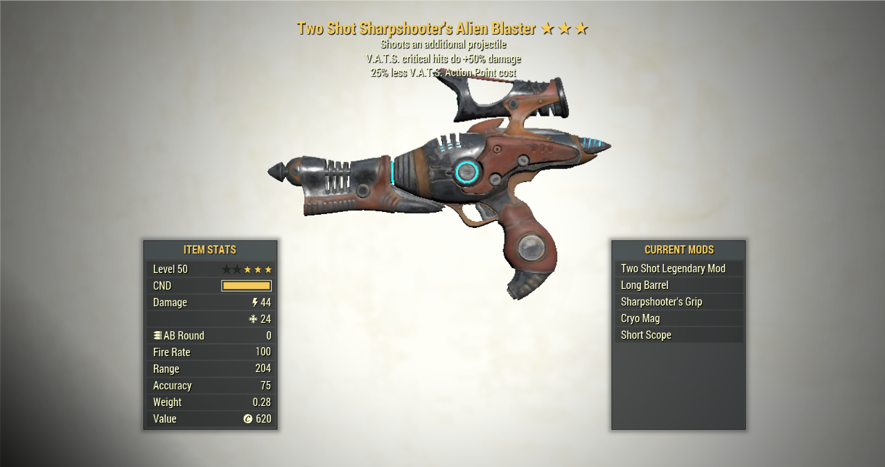 Two Shot ALIEN BLASTER 50% VATS Crit [25% VATS Cost] Fallout 76 (PC Only)